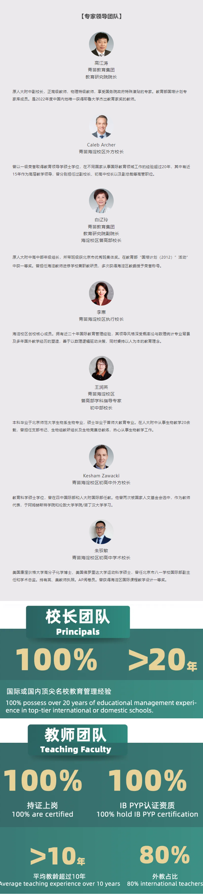 海淀青苗初高中学部拥有一支国际化教育团队,共有全职教师60余名,中外籍教师比例为2:1。其中,超过83%的教师拥有硕士及以上学位,他们毕业于哈佛大学、哥伦比亚大学、多伦多大学、英国伦敦学院、清华大学、北京大学等世界学府。学校实行小班制教学,师生比例为1:5,确保教师能够充分关注每一位学生的个性化成长。