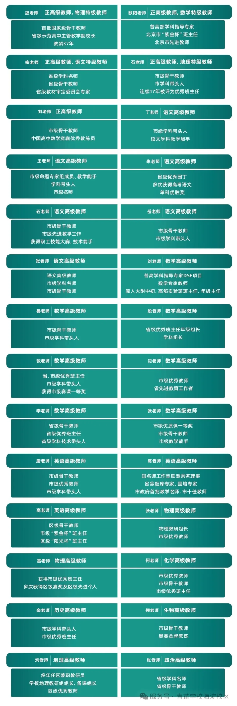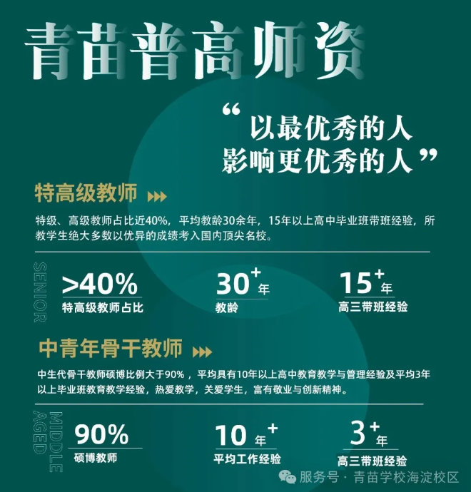 海淀区青苗学校普高部拥有一支顶配的师资及管理团队。学校聘请国内公立学校资深管理者领衔普高部管理工作,对学校的办学理念、教学特色等方面进行优化提升。