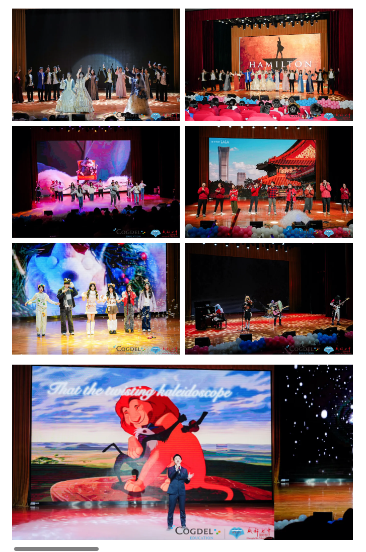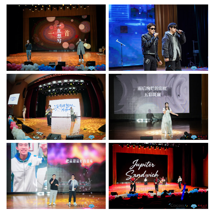 从活力四射的开场舞《Batter Up》,到深情动人的歌曲《十二月奇迹》、《Can You Feel the Love Tonight》;从丝丝入扣的音乐剧《汉密尔顿》经典选段《Satisfied》,再到热血沸腾的乐队演出《没有理想的人不伤心》、《八》,同学们用音乐与舞蹈等多种形式诠释了对成长、理想与未来的思考。教师节目《Zoo》、《明天会更好》更是将现场气氛推向温馨高潮,展现师生同台,共赴新程的深厚情谊。