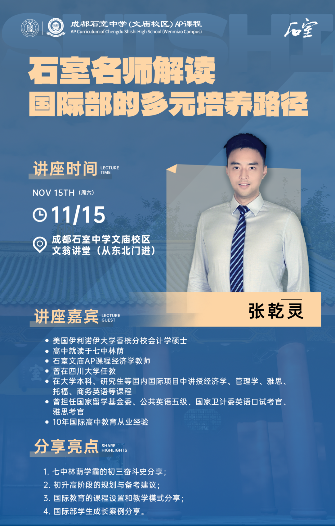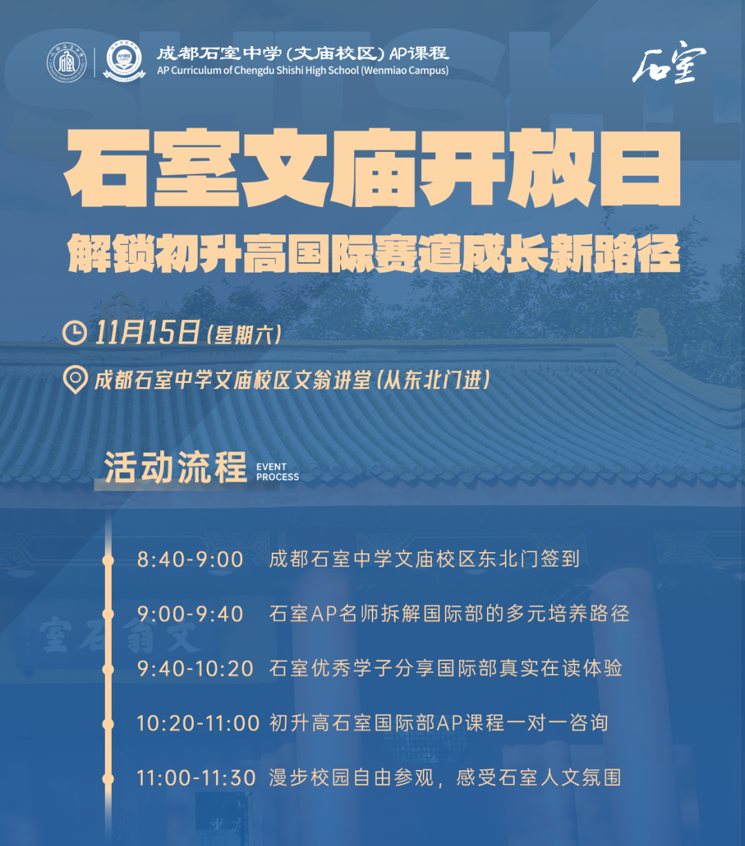 成都石室中学文庙校区AP课程举办专场校园开放日,特邀石室文庙AP课程资深经济学教师与石室在读优秀学子,带来极具参考价值的分享,欢迎家长们走进石室文庙,与我们一起探索高中教育的新可能。
