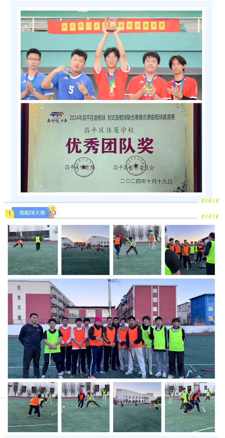 曲棍球课程是佳莲学校的特色课程之一。近年来学校球队参加了大大小小的比赛二十余场,均取得了优良的成绩。例如,6月18日,佳莲学校派出了11名队员前往北京市芦城体育运动学校参加2023门头沟区曲棍球邀请赛。经过激烈的角逐,本校曲棍球获得了第二名的好成绩!佳莲学子受邀参加了由香港曲棍球总会主办的国际青少年曲棍球比赛,比赛分为5人制和混合青少年6人制曲棍球比赛。并于十月昌平二中回龙观校区举办的2024年昌平区曲棍球、软式曲棍球联合赛暨京津曲棍球邀请赛中展现了卓越的竞技水平和顽强的拼搏精神。