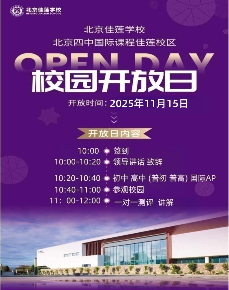亲爱的家长们,北京佳莲学校(北京四中国际课程佳莲校区)校园开放日将于2025 年 11 月 8 日&15日盛大开启!此次开放日涵盖初中、高中(普初、普高)及国际 AP 课程,诚邀您与孩子一同走进校园,全方位感受学校的教育特色与升学优势。