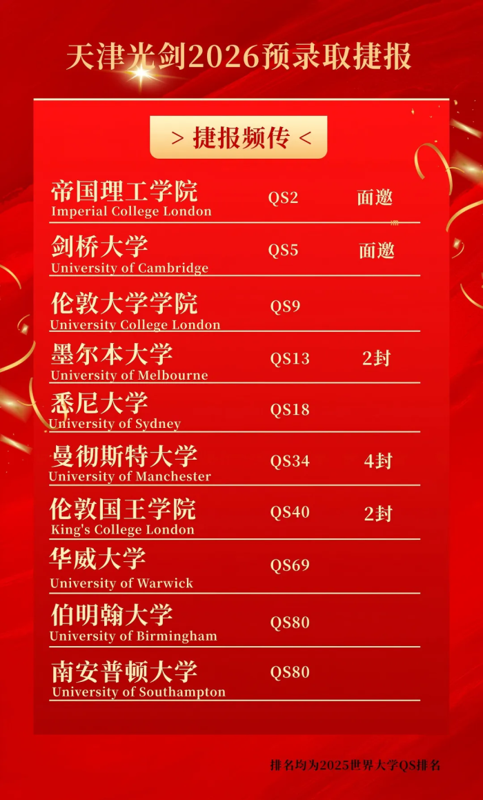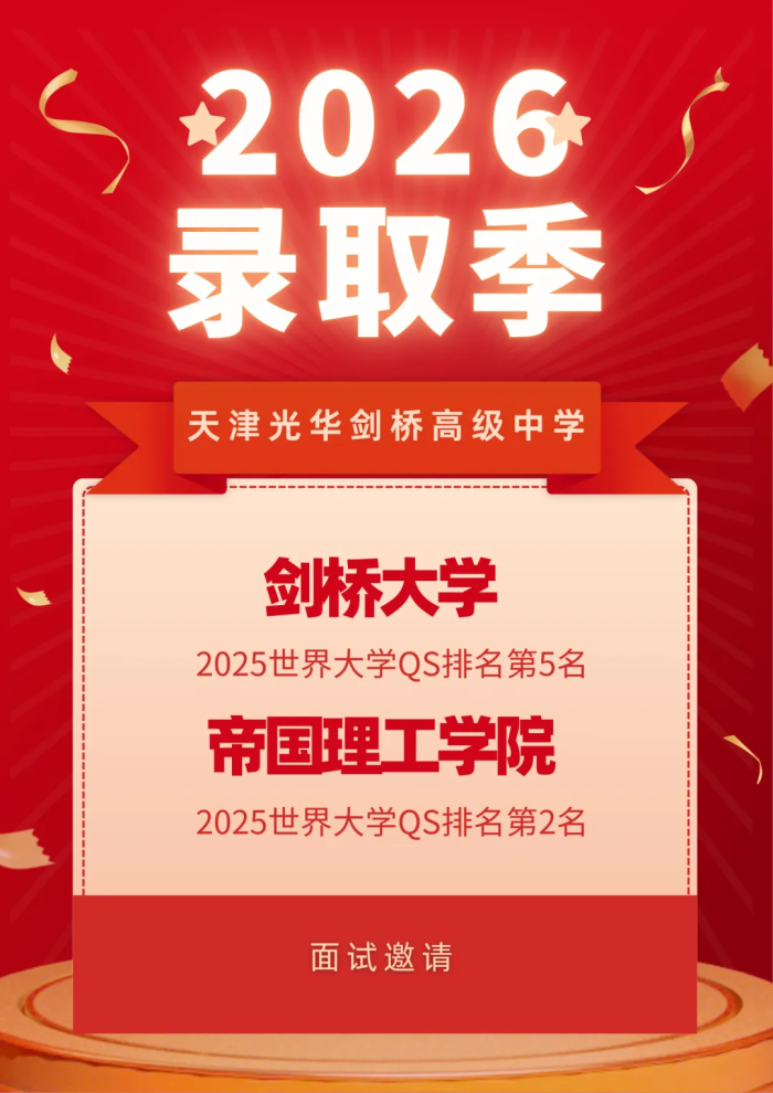 近日,天津光华剑桥高级中学2026 届国际高中毕业生群体传来振奋人心的捷报:在全球高等教育资源竞争日趋激烈的背景下,本校学子凭借深厚的学术积淀、全面的综合能力与鲜明的个人特质,获得剑桥大学、帝国理工学院的面试邀请,成功斩获伦敦大学学院、墨尔本大学、曼彻斯特大学等全球学府的认可,累计收到 13 份预录取通知及 2 份面试邀约。