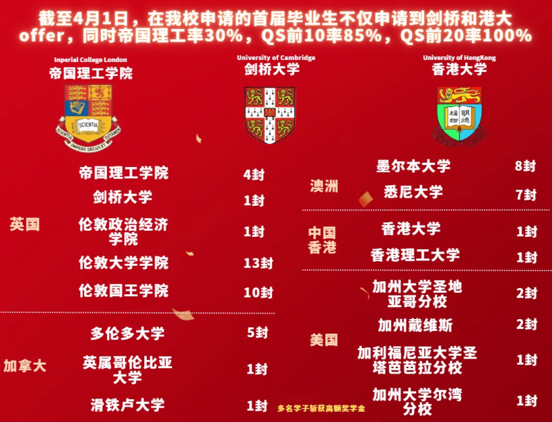 截至4月1日,本校首届毕业生申请成果斐然,成功斩获剑桥大学、香港大学、伦敦政治经济学院等牛校offer。截至目前,30%首届毕业生取得帝国理工offer,85%首届毕业生取得QS前10院校offer,首届毕业生均取得QS前20院校offer。