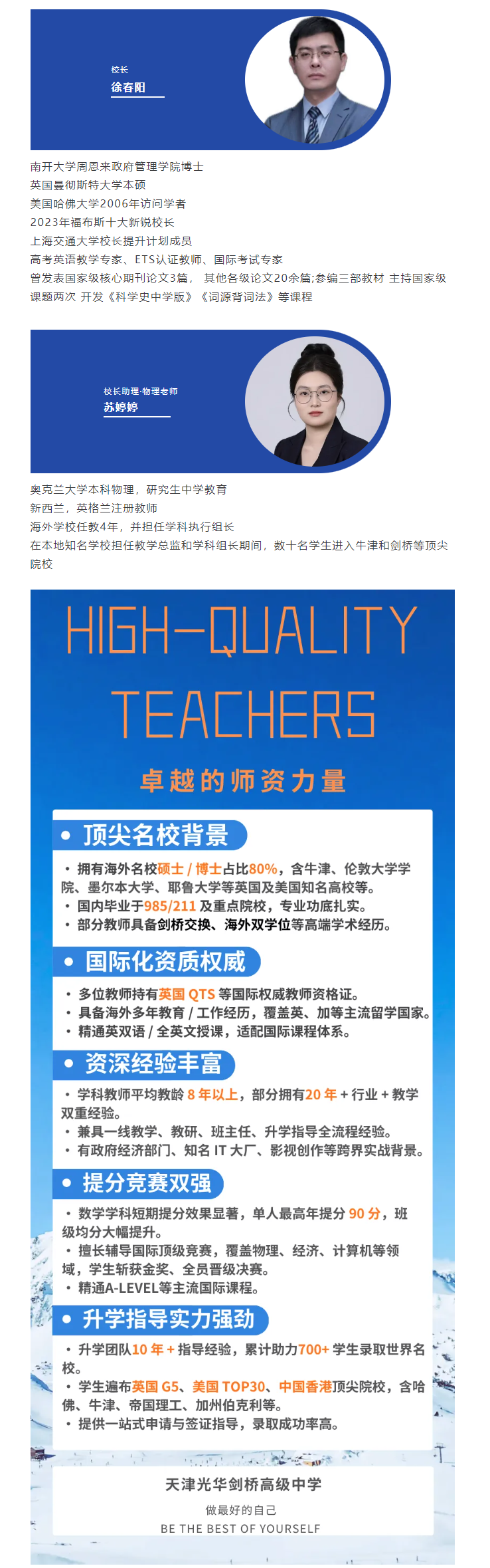 天津光华剑桥高级中学由光华教育集团举办,位于天津市北辰区经济开发区,是一所以创新教育为特色的民办高级中学。学校以创新教育为驱动,融合光华教育集团、光华剑桥(上海)十多年的办学经验以及全球创新教育资源,开设普通高中和融合高中课程,实行双轨运行模式,致力于培养具备中国文化涵养与国际适应能力的未来创新型人才。