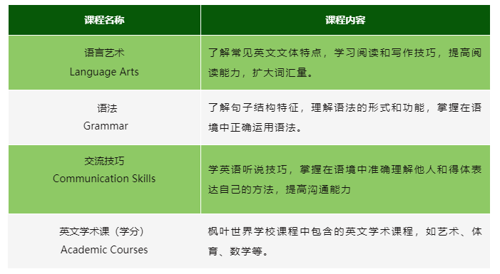 枫叶高中枫叶世界学校课程使用原版英文教材,由外籍老师全英文教授,因此对学生的英语语言能力要求较高。高中强化班课程由ESL教师任教,学生提前进入英语强化学习和枫叶高中课程学习技巧的培训,熟悉全英文课堂环境和沉浸式、互动式的教学模式,为高中阶段的学习和未来大学申请的成功打下更为坚实的基础。