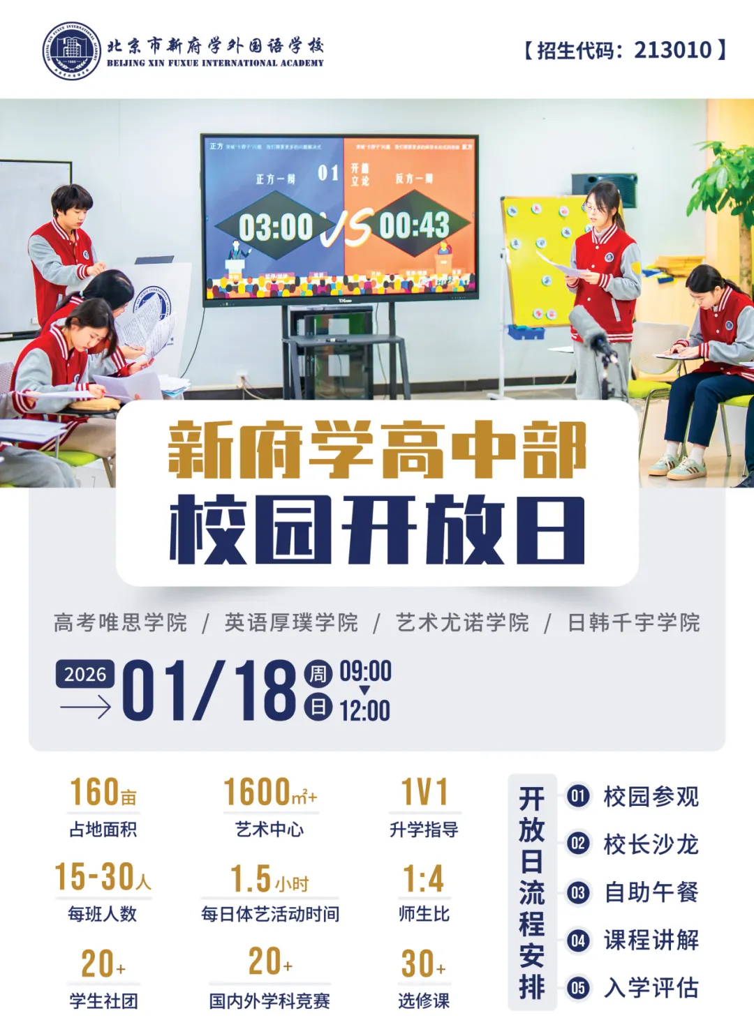 为了让家长们进一步了解我们,缓解择校焦虑,新府学高中部将于1月18日(周日)开展校园综合开放活动,包含参观校园、课程咨询、校长面对面、入学评估、升学规划指导、自助午餐等。