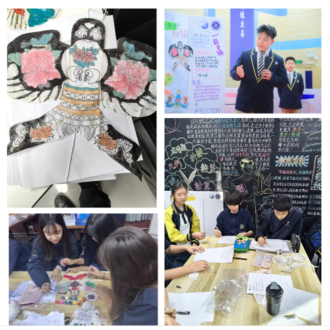 在本学期的MYP单元设计展示中,以2025年一道中考题,非遗纸鸢“京燕”为背景,学生通过动手实践制作纸鸢“京燕”得到了诸多启发,学生将探究等式关系与轴对称图形性质与现实生活,非遗紧密相连,每个细节都渗透着“数学思维+人文素养”的多元化融合。让抽象知识在画笔,实践中生长出可触的形态,成为连接知识、思维、实践与创造的共同体。这不仅体现了数学思想在融合学科中的重要作用,也体现了生活处处皆数学的理念。