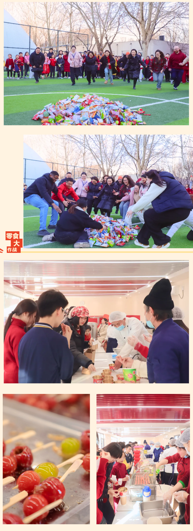 抢零食大作战~老师们化身孩子们坚实的后盾,为自家宝贝全力冲刺抢零食,一旁的孩子们围拢欢呼,热闹的互动里,师生情谊双向奔赴,成为校园里最动人的光景。