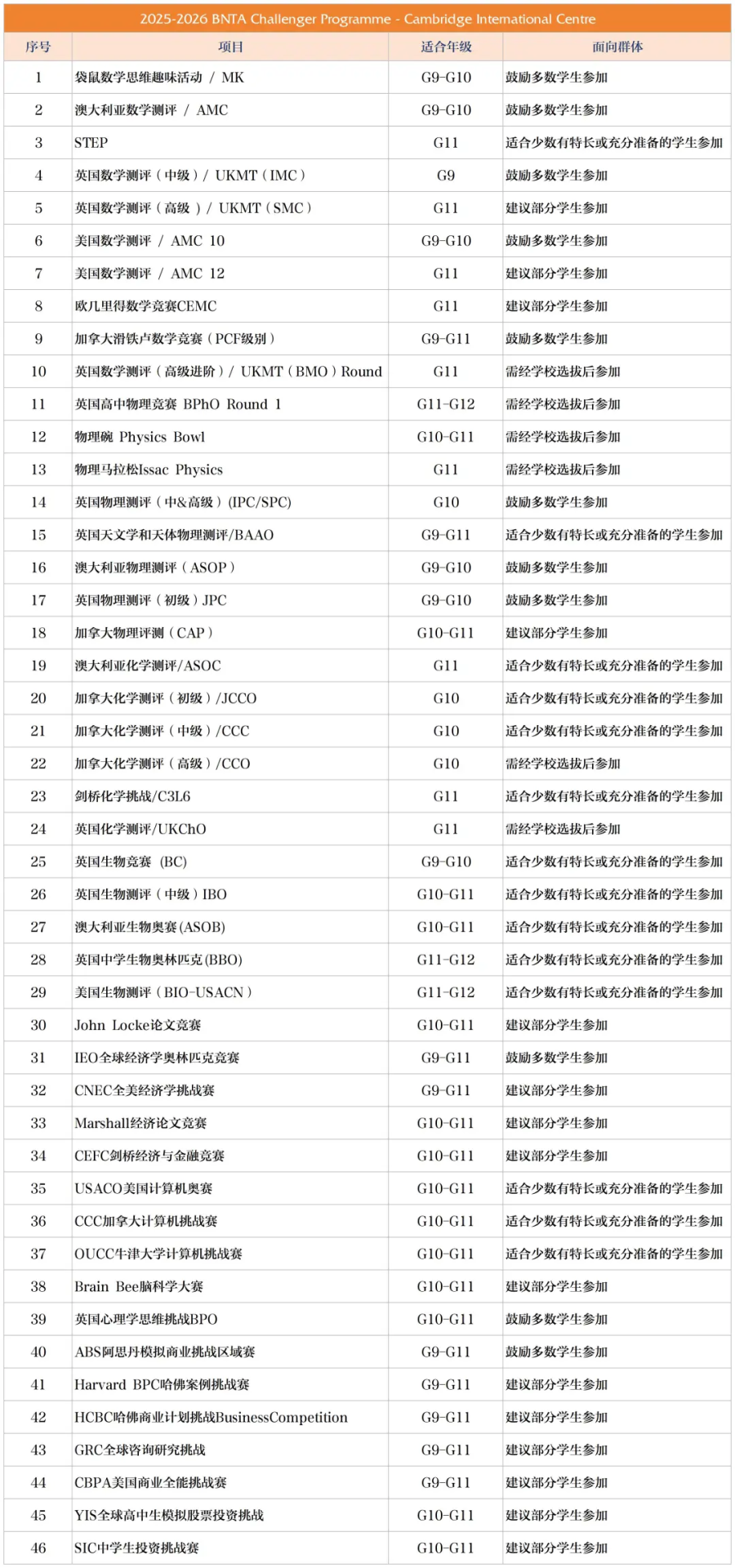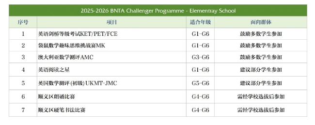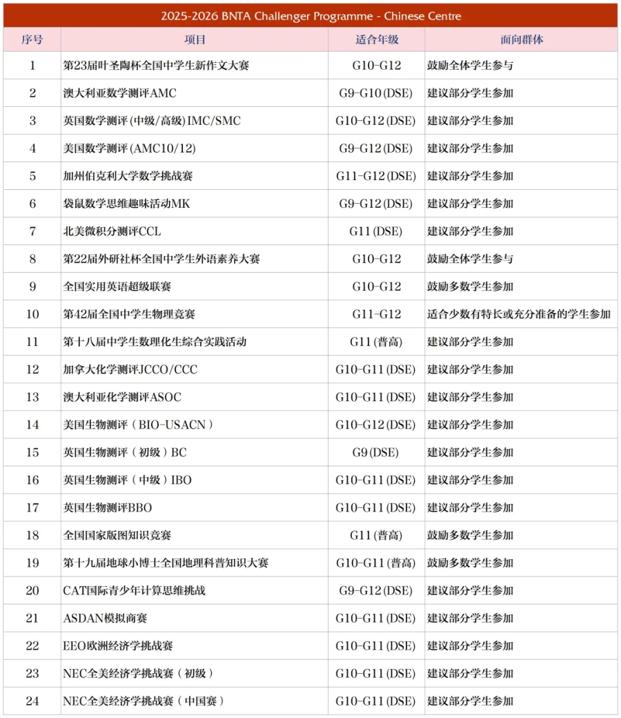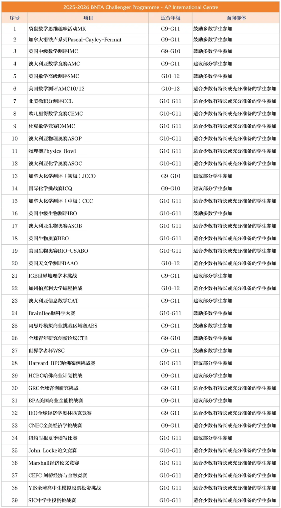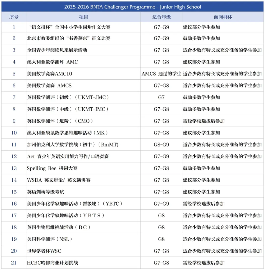 2025年,学校在166项“BNTA竞赛白名单”基础上优化路径、完善竞赛体系,再次推出“Challenger Programme”,通过层次化的设计,为每一名学生铺设个性化的、循序渐进的学术升维之路。