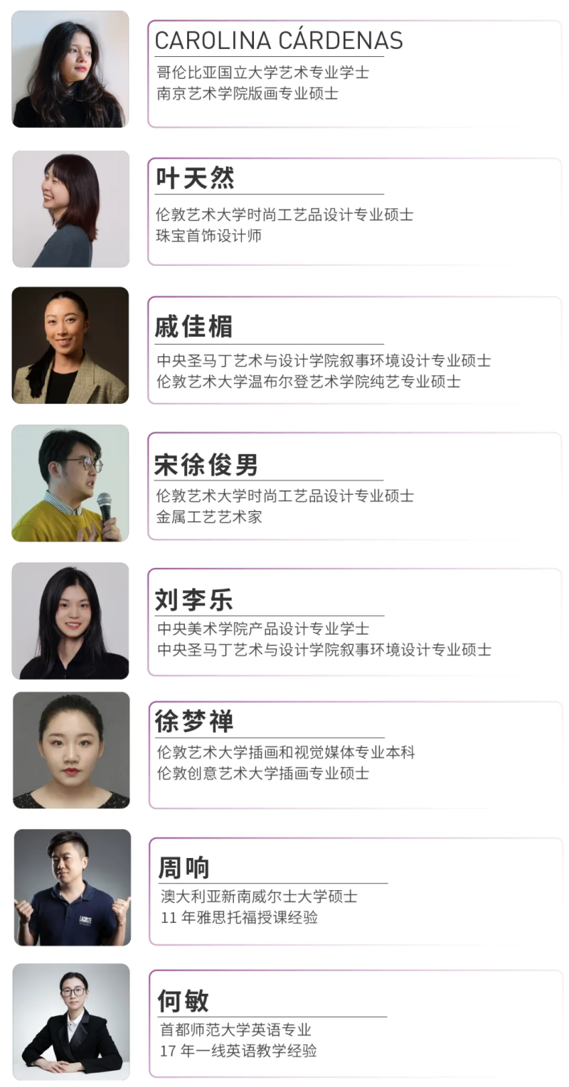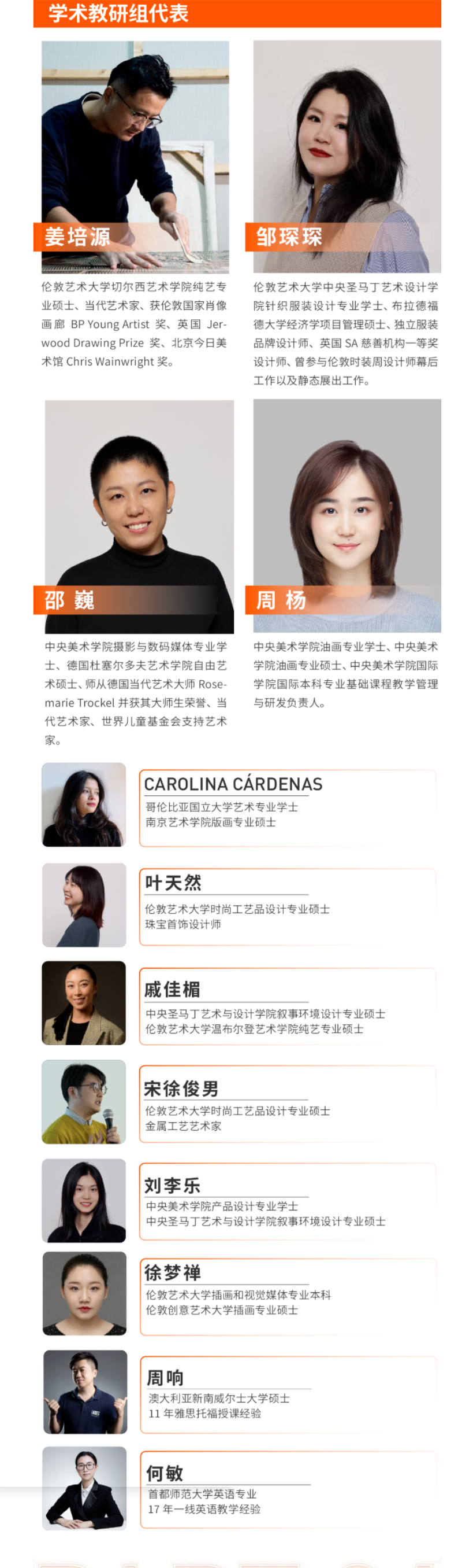 项目充分贴合每个学生特性,为有一定艺术素养或潜力的初中毕业生及高中在读学生,提供高水准的艺术和英语文化通识课程;为申请海外艺术学校的艺术生提供国际艺术课程、项目创作、语言课程、文化通识课程、升学指导及出国签证指导等一系列专业化教学和留学服务。