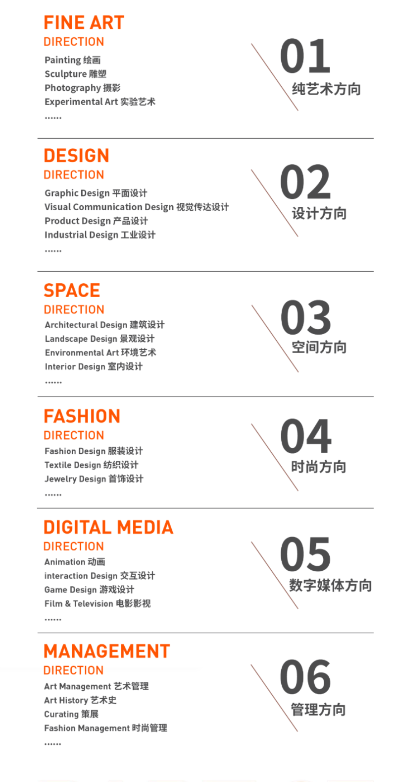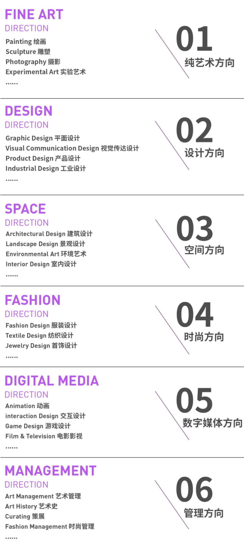 采用英美艺术大学本科课程,划分学生专业方向。帮助学生进入专业细分领域探索艺术创作真谛。国内两年课程设置采用多维度的学术评估标准,包含创作性实践、调研技能探索、沟通技巧、技术和媒介的应用、概念材料实验和创作性过程探究等。