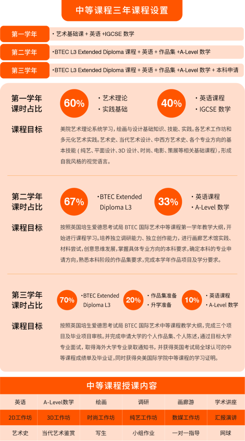 国内2年:课程安排包括艺术基础课程、艺术专业技能训练、英语课程,在两年中可获得不超过外方院校总学分1/3的学分豁免。在校成绩合格的学生能够同时获得国际学院项目课程两年学习证明+英国培生爱德思考试局颁发的BTEC等级证书。