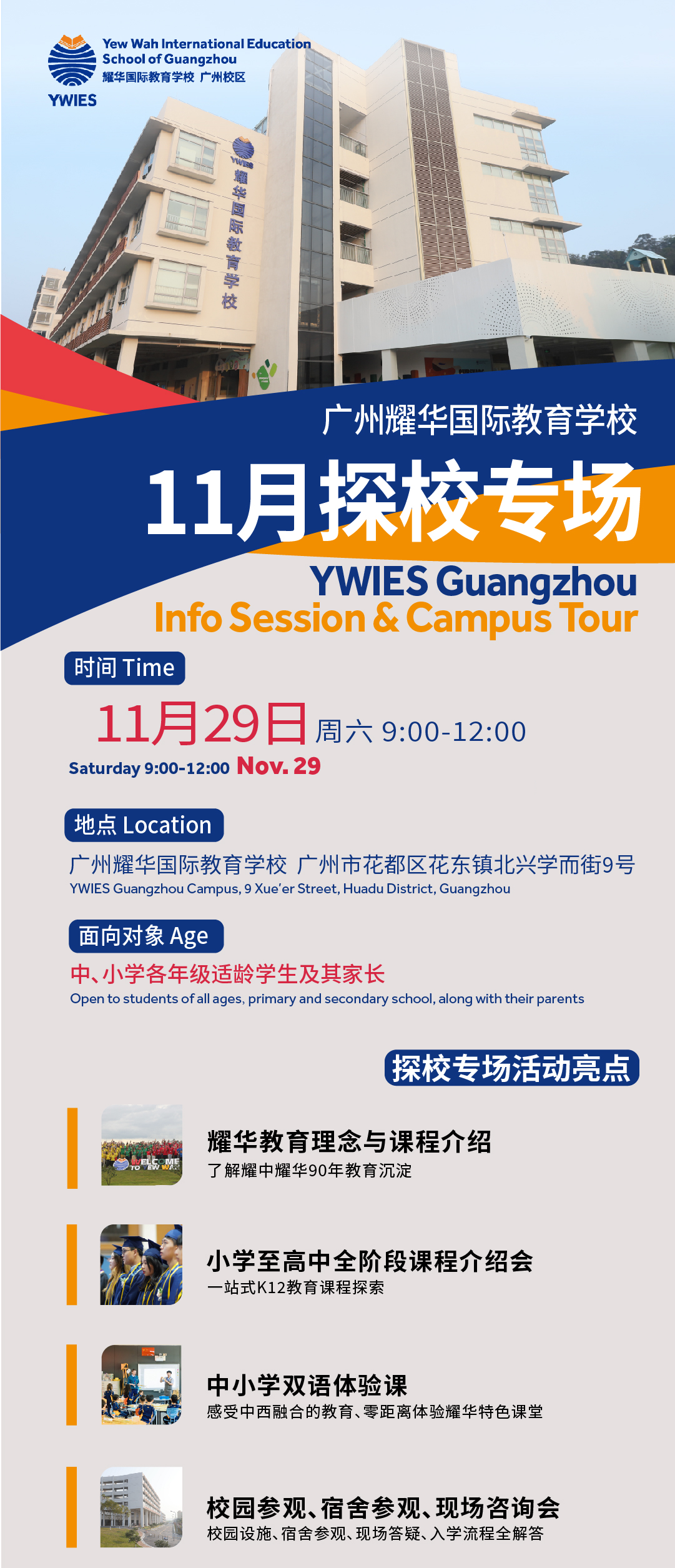 亲爱的家长们,广州耀华国际教育学校(YWIES Guangzhou)11 月探校专场将于11 月 29 日(周六)9:00-12:00举办,诚邀您与孩子一同走进校园,全方位了解耀华教育特色与 K12 课程体系。