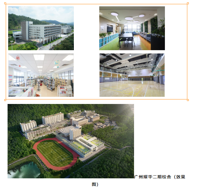 耀华国际教育广州校区位于九龙湖国际社区旁,校舍由海外顶 级设计公司设计,建筑风格大气时尚。校园设施的设计兼顾各年级学生的需要,设备齐全,为学生提供安全和温馨的校园环境;宽敞的教室、现代化的图书馆、体育馆、运动场、多媒体中心和学生宿舍,为学生的校园学习、生活提供悉心周到的服务。