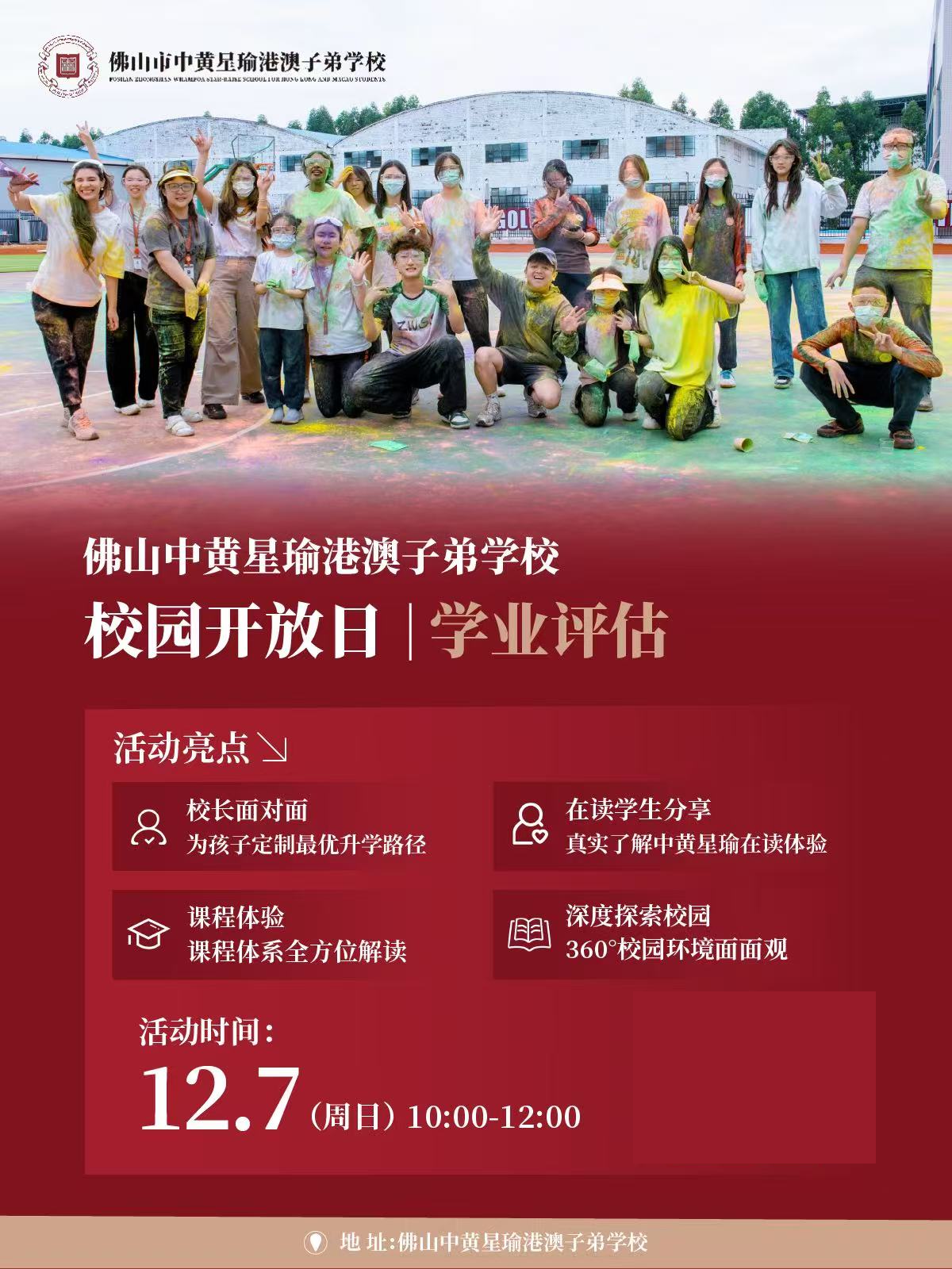 亲爱的家长们,佛山中黄星瑜港澳子弟学校校园开放日将于12 月 7 日(周日)10:00-12:00举办,诚邀您与孩子一同走进校园,全方位了解学校特色与升学规划,参与学业评估专场活动。