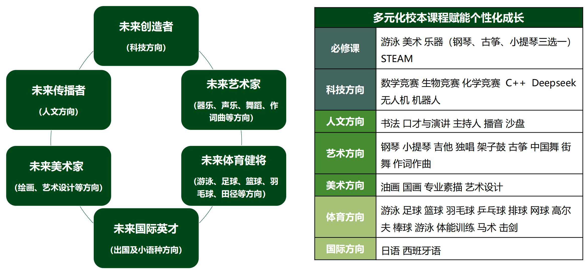 在保质保量完成国家标准课程基础上,研发优质校本特色课程资源。聚焦科技、艺体、语言三大领域,着力打造六个人才培养方向。衔接高考志愿选择,支撑专业志向,构建一体化、长链条人才培养模式。
