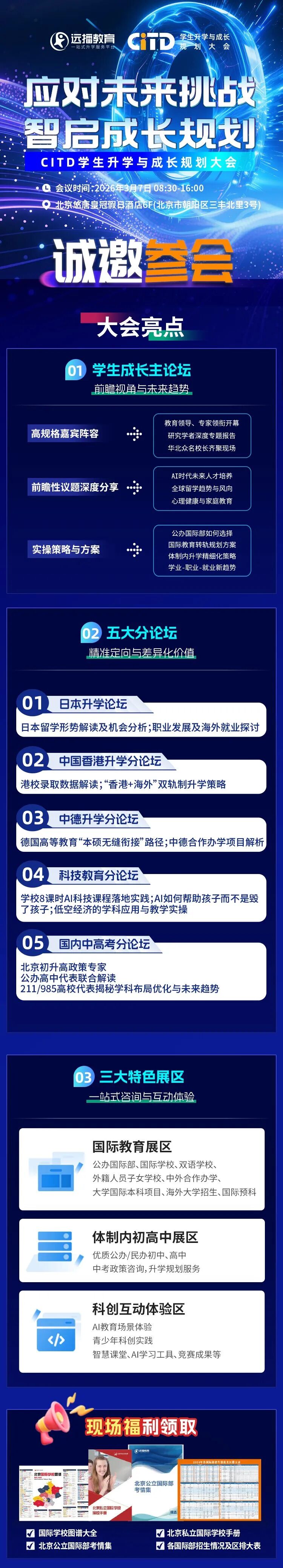 3月7日,CITD学生升学与成长规划大会将于北京悠唐皇冠假日酒店六层举办。特邀北京热门学校参展,阵容强大,一站式满足您的教育需求!
