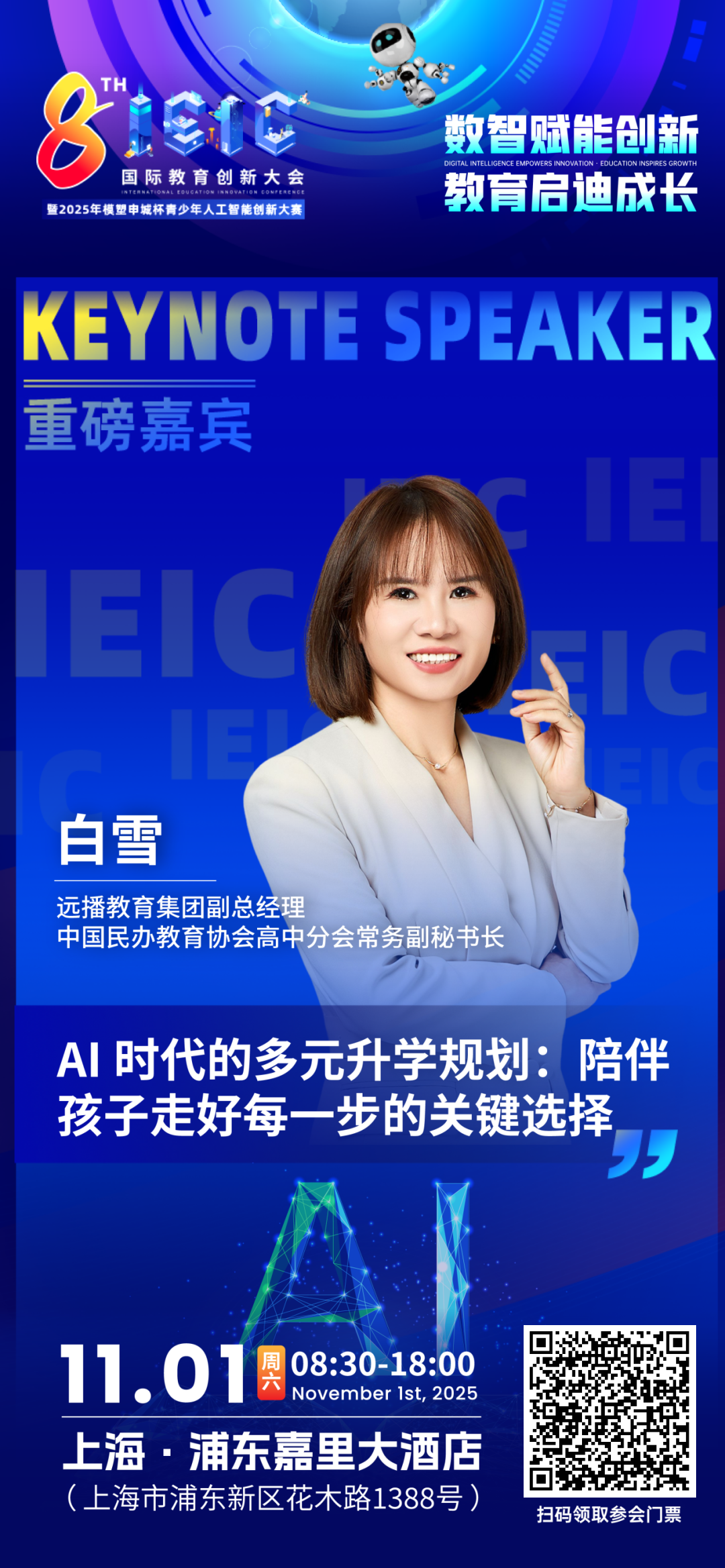 11月1日,白雪女士将出席第八届IEIC国际教育创新大会,围绕AI时代的多元升学规划,深度剖析当代家长的升学痛点,从政策、路径、课程、学校定位等维度,专业解析体制内与体制外升学路径差异,帮助家长在教育的分岔路口,链接匹配适合的优质教育资源,让我们共同期待这场思想盛宴!