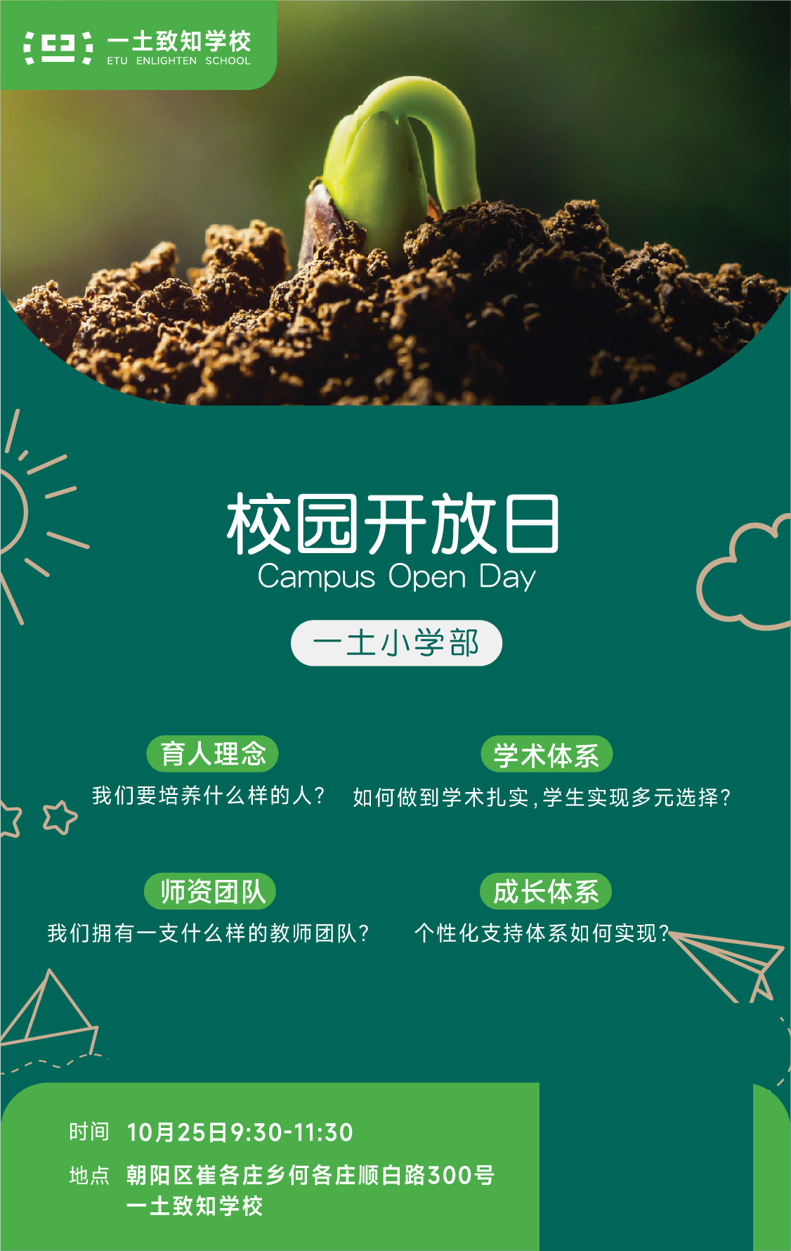小学作为孩子进行知识学习第一步,也是为以后校园学习奠定良好的基础的关键。我们希望回到教育的本质,培养学生幸福生活与应对不确定未来的能力。我们希望助力每一位学生发现自己的天赋与热情所在,并用个性化的支持与赋能型的高效学习模式, 帮助他们成为具有全球视野、 家国情怀的国际化人才。