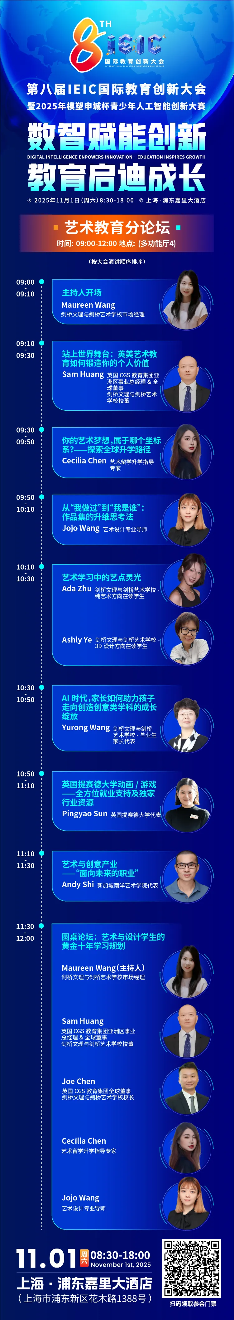 作为IEIC国际教育创新大会的重要板块之一,艺术教育分论坛致力于发掘艺术教育在AI时代的独特价值,探寻艺术教育的新未来。本论坛由剑桥文理与剑桥艺术学校协办,汇聚海外艺术牛校掌门人、升学专家、专业导师及艺术留学学生&家长代表,全景解析从升学路径、作品集打造到职业发展的完整生涯规划。