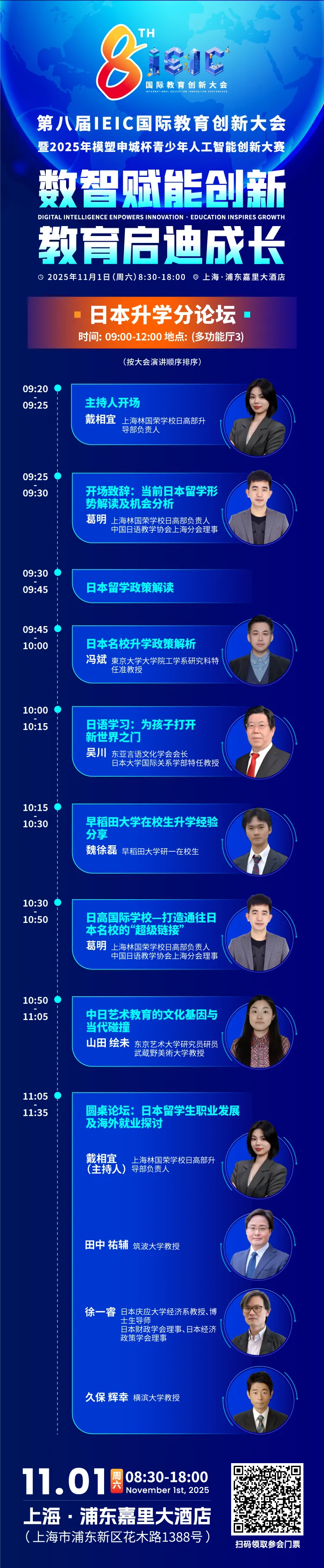 第八届IEIC大会精准聚焦日本升学需求,全力打造日本升学分论坛。本次论坛由上海林国荣高中协办,邀请东亚言语文化学会会长、东京大学/东京艺术/筑波/庆应/横滨大学教授和研究员坐镇,全方位助力学子打通赴日升学全链路,为赴日求学之路筑造牢固基础。