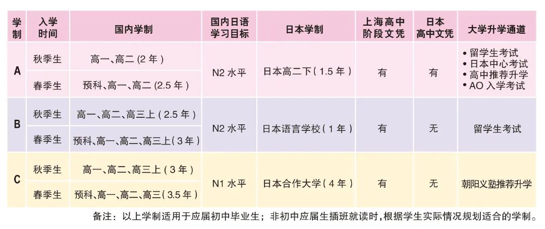 高一、高二、高三上学期在国内就读,高三下学期进入日本合作的语言学校,考核通过后颁发中国高中文凭,强化日语、参加日本留学生统一考试课程。