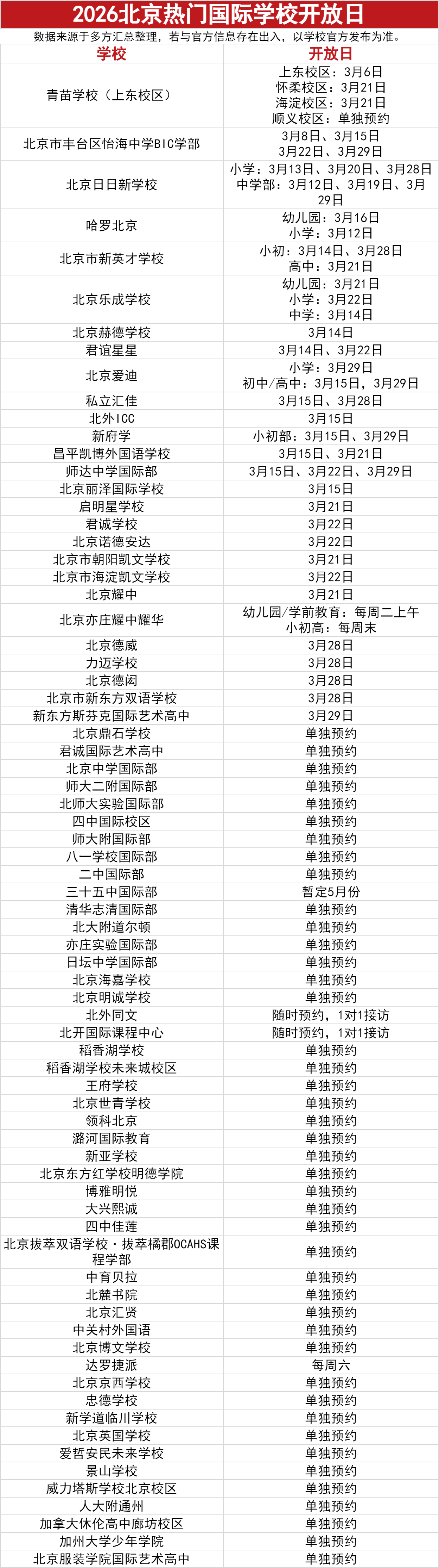 2026 年春季升学季已至,为帮助家长与学生全面了解北京各国际学校的办学特色、课程体系及校园环境,我们整理了 3 月北京热门国际学校开放日信息。从青苗学校、朝阳凯文到力迈学校等多所院校,均已开放校园探访通道,部分学校还设置了校长论坛、课堂体验、一对一咨询等专属环节,为家庭提供沉浸式择校参考。