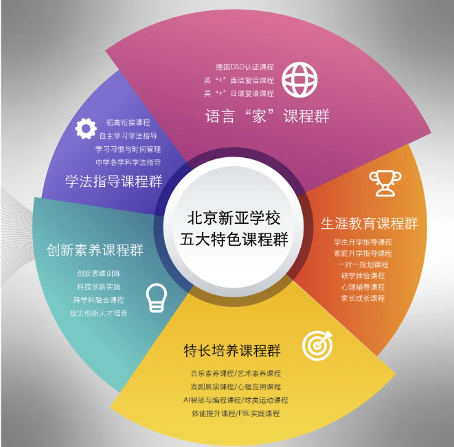 新亚学校高中部以「培养具有人文底蕴、科学精神、全球视野的时代担当者」为目标,基于普通高中课程方案和学科课程标准,坚持以学生为中心,融合国际先进教学方法,搭建发展学生综合素养的五大特色课程群,同时依托新校区标准化、现代化、国际化、智慧化“四化”优势,为学生成长赋能。