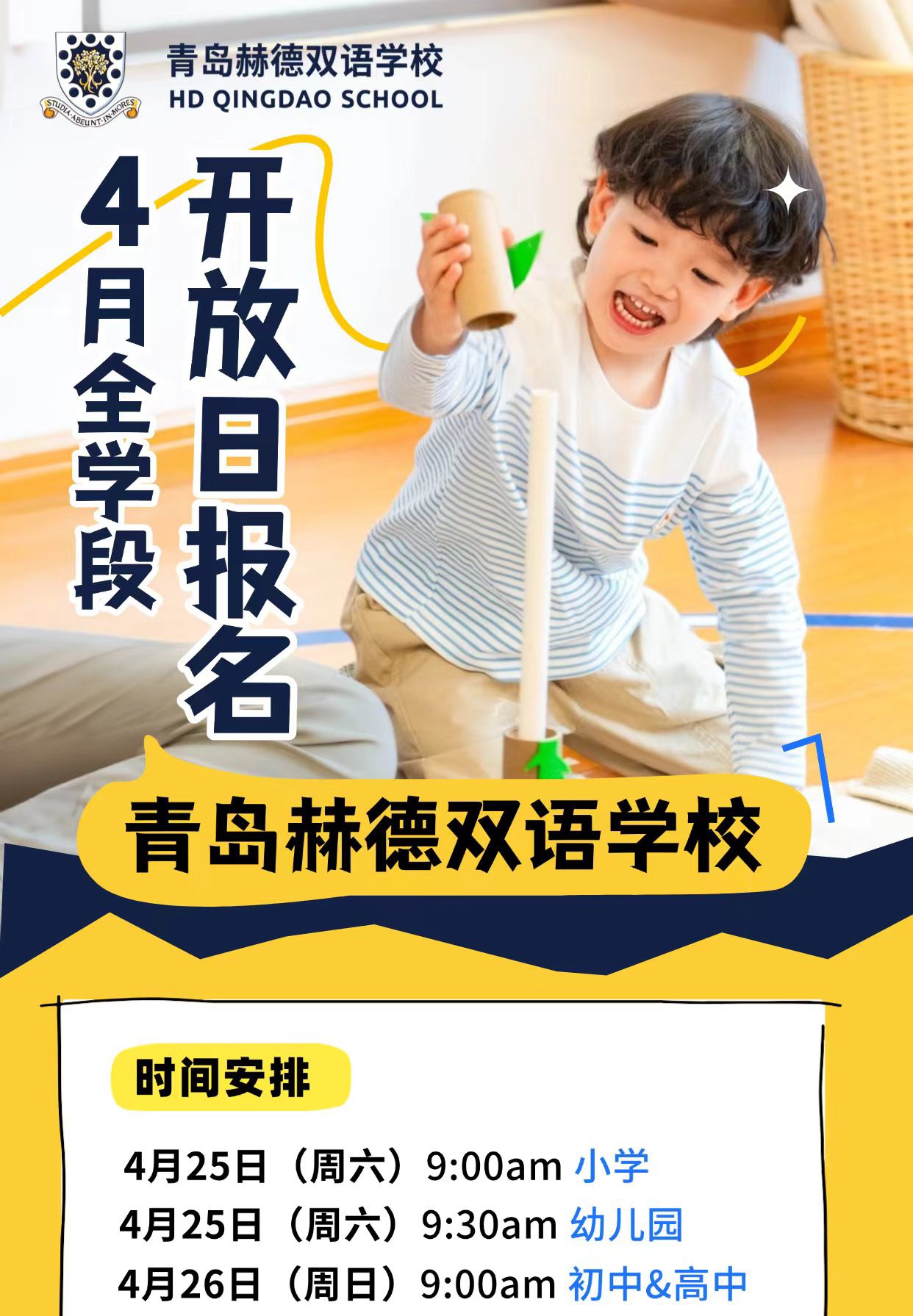 青岛赫德双语学校将于4月举办全学段开放日活动,面向幼儿园、小学、初中及高中阶段的学生及家长开放,可按需选择对应学段场次参与。