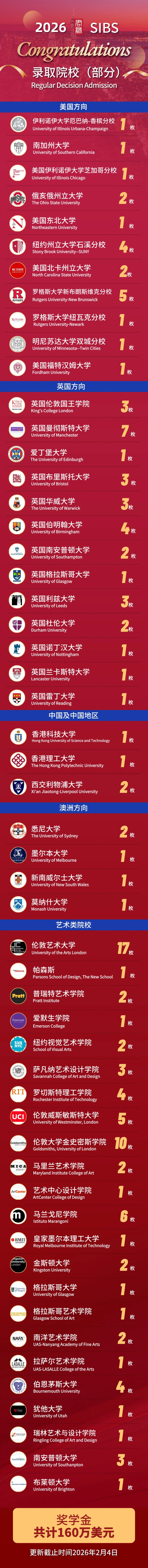 截至日前,本校2026届66名毕业生已在全球申请中斩获150余封录取通知书,并狂揽超过160万美元奖学金,约合人民币1200万元,取得了令人瞩目的升学成绩。