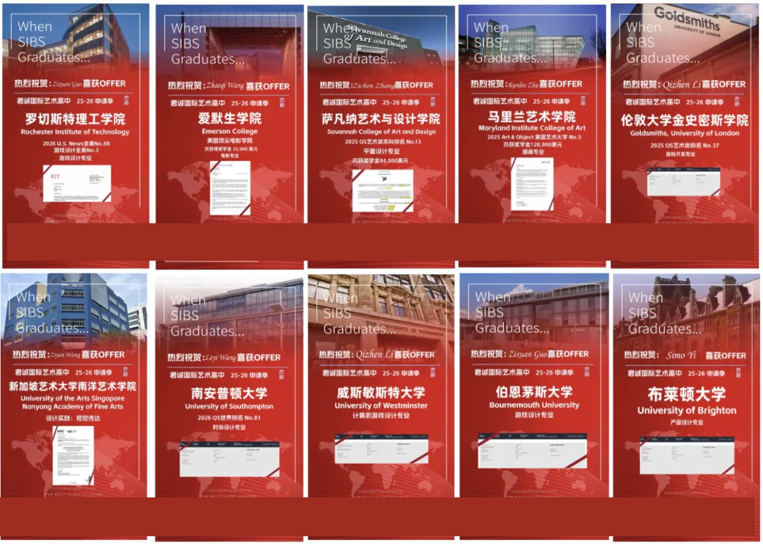与此同时,本校在创意艺术领域也取得了令人瞩目突破。同学们以其独特的创造力与扎实的专业功底,赢得了全球艺术殿堂的广泛认可。君诚艺术方向共获得全球数十所院校、近百封录取。