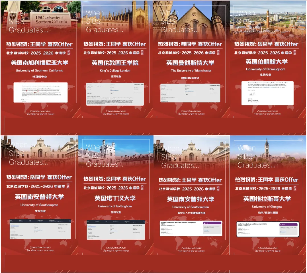 不仅有美国久负盛名的南加州大学、东北大学、俄亥俄州立大学等学府均向同学们抛来了橄榄枝,同时还有英国方向的伦敦国王学院、曼彻斯特大学、伯明翰大学、格拉斯哥大学、杜伦大学、华威大学等罗素集团牛校纷纷发出录取。