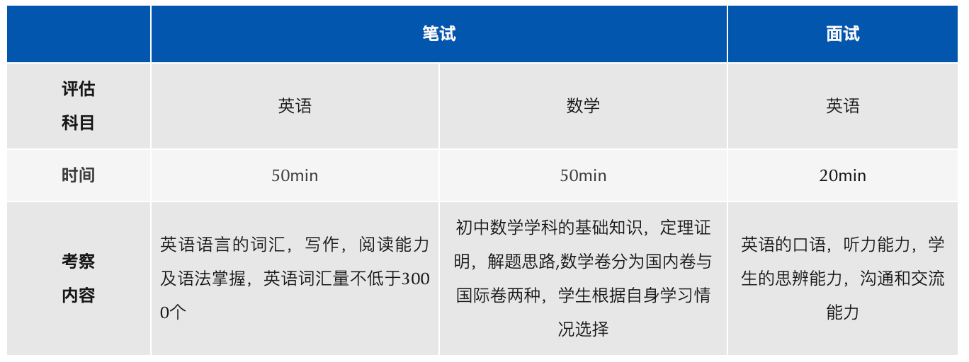 上海阿德科特学校入学评估分为笔试(英语,数学)、面试(英语)两部分。