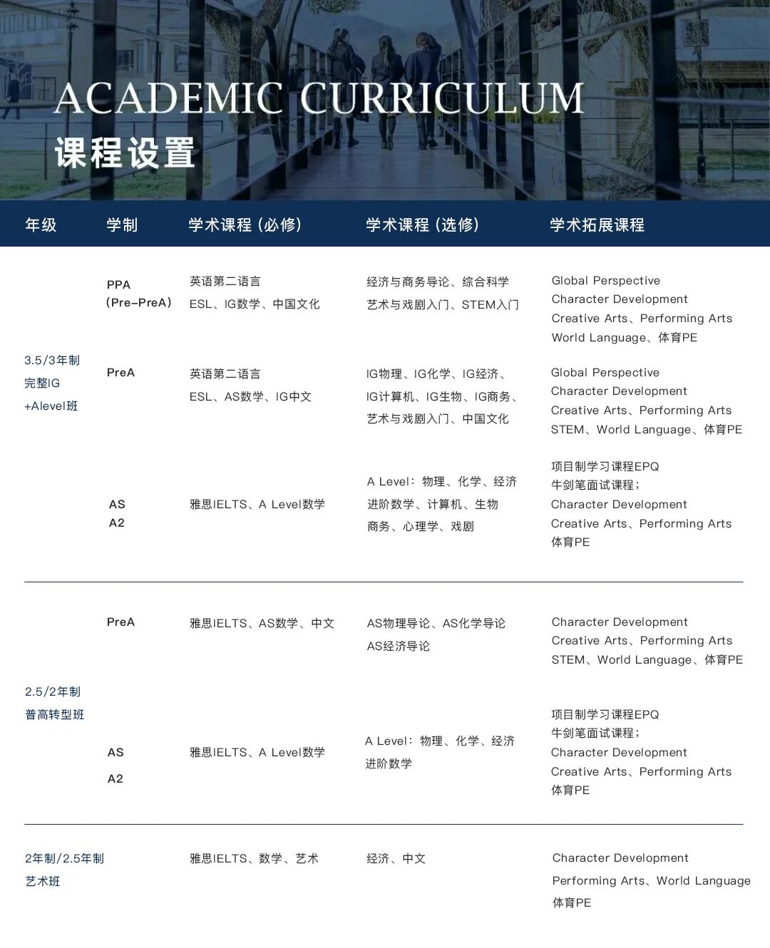 在学术课程板块,开设IGCSE&A-Level&IBDP共计40多门课程,是目前国内开设IGCSE&A-Level课程最多的A-Level 学校之一,可以满足学生专业选择;