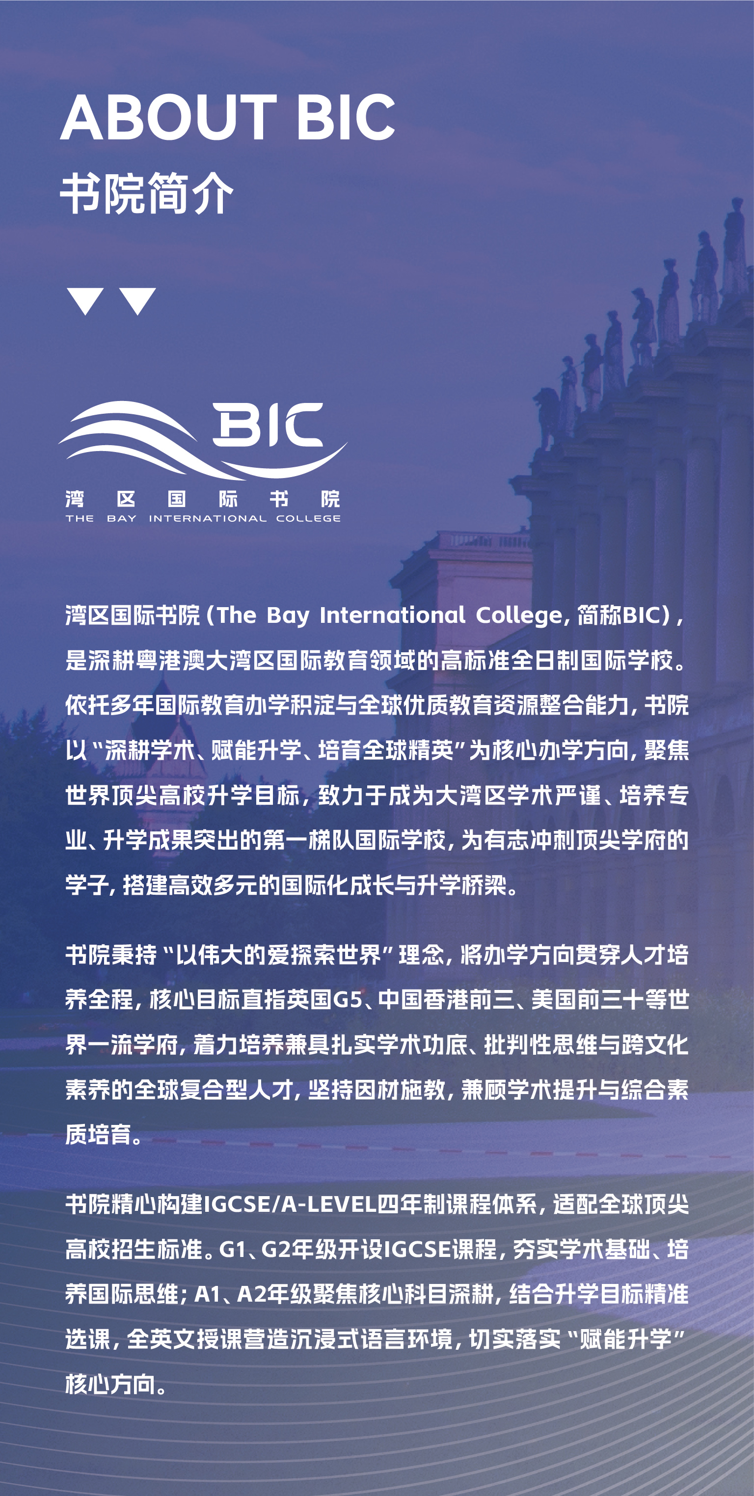 湾区国际书院(The Bay International College,简称BIC),是深耕粤港澳大湾区国际教育领域的高标准全日制国际书院。依托多年国际教育办学积淀与全球优质教育资源整合能力,书院以“深耕学术、赋能升学、培育全球精英”为核心办学方向,聚焦世界高校升学目标,致力于成为大湾区学术严谨、培养专业、升学成果突出的第一梯队国际学校,为有志冲刺学府的学子,搭建高效多元的国际化成长与升学桥梁。