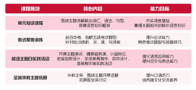 课程以“每月一主题”推进,主题涵盖日常生活、文化交流、科技发展、环境保护、全球视野等领域。每个主题单元围绕“单元知识课程”“考试聚焦训练”“英语主题日实践活动”“全英外教主题拓展”四大核心板块展开,构成“知识输入—技能训练—实践应用—拓展提升”的完整教学闭环。