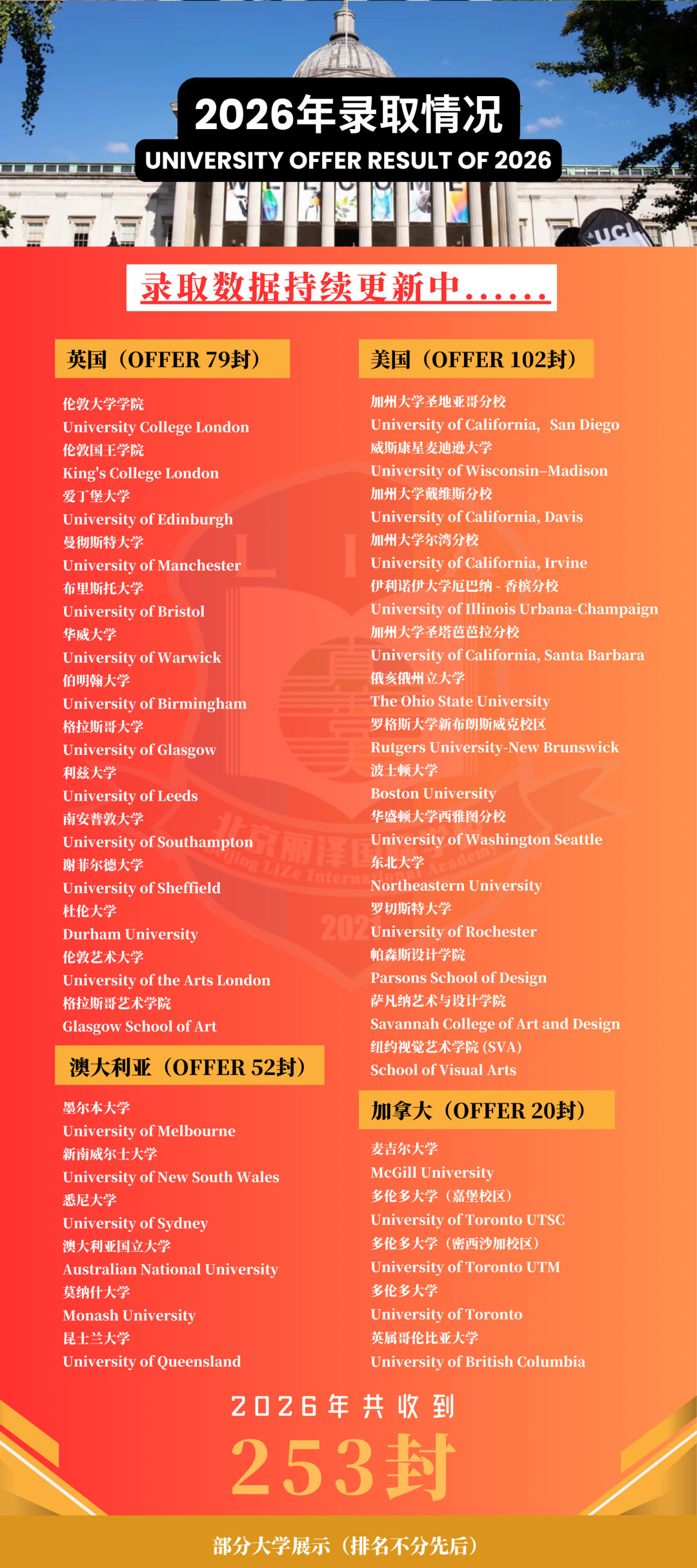 本次升学成果再创新高,整体表现出色:申请学生99%获得录取offer,累计斩获253封海外院校录取通知书,人均6封。录取覆盖英国、美国、加拿大、澳大利亚院校及世界艺术院校,如伦敦大学学院(UCL,英国G5超级精英大学、罗素集团成员,QS世界排名第9)、加州大学圣地亚哥分校(UCSD,美国USNews排名29)、伦敦艺术大学(UAL,QS艺术设计类排名第2)等世界学府。录取质量与数量持续保持高位稳定,以实际成果充分彰显了学校雄厚的办学实力和学子们不可限量的未来潜能。