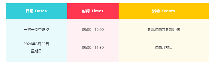 此外,2026年3月22日星期日09:30 - 11:30将举办校园开放日。