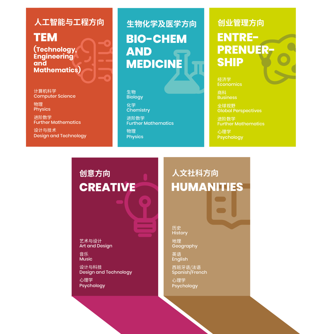 学校在高中阶段开设五大学术专业方向。学生可以根据个人兴趣特长、未来专业和职业发展规划进行科目选择,持续深耕,参加国际赛事,提升学术竞争力,收获学府招生官的青睐。