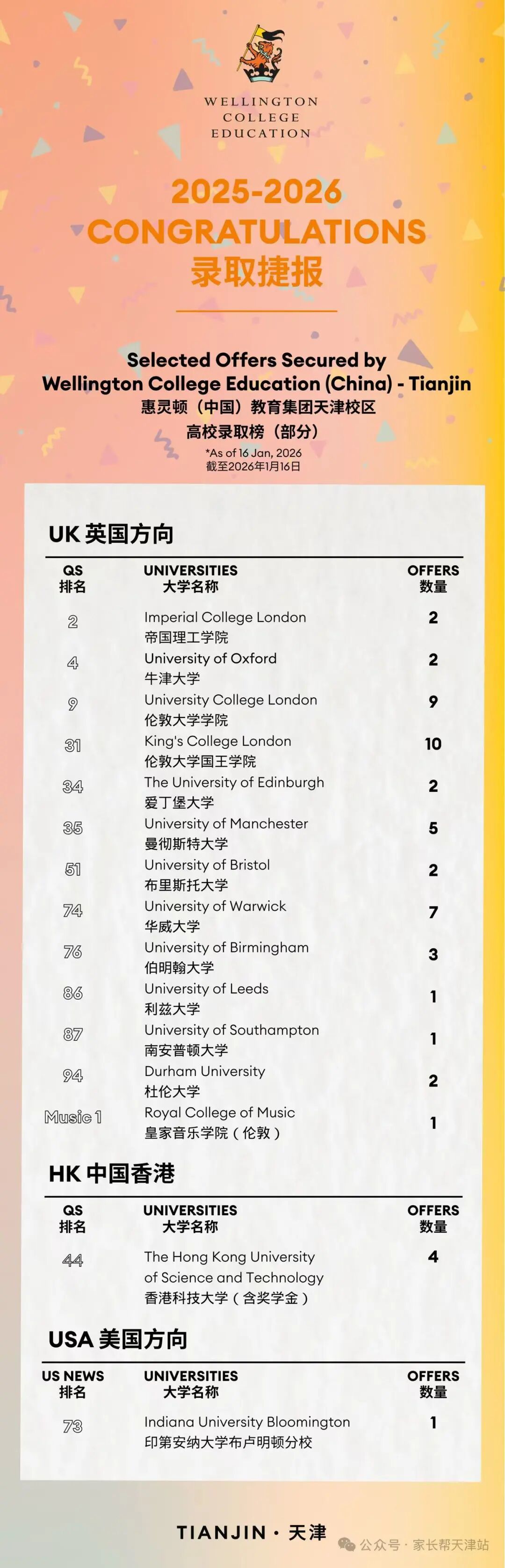 惠灵顿天津校区学子从高一入学开始即开始大学升学指导以及规划,A Level考试成绩可以申请除了中国大陆以外其他地区的大学。往届毕业生统计有70%左右可以申请到世界QS排名前100的大学,30%左右可以申请到世界QS排名前20的大学。