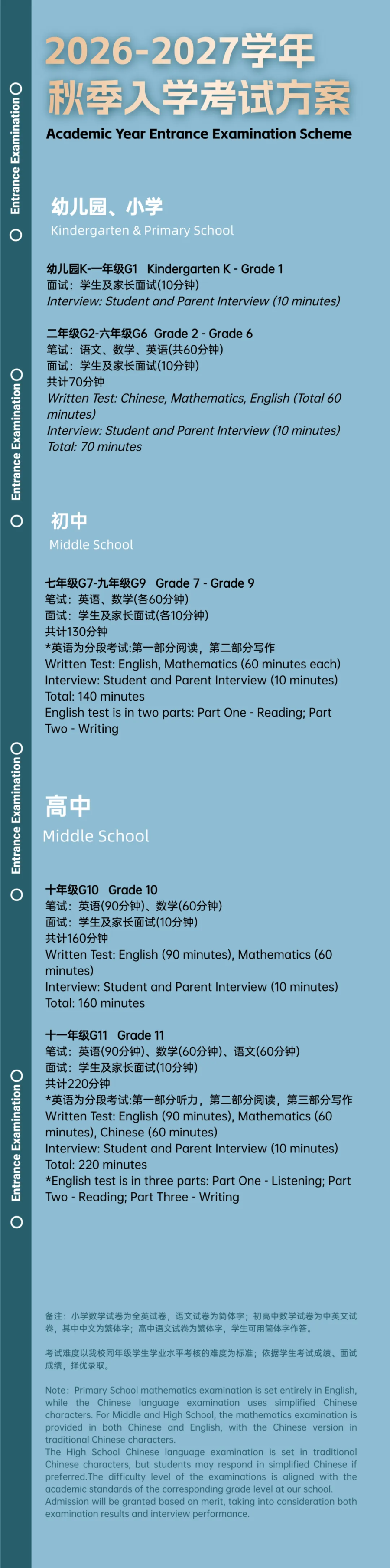 广州暨大港澳子弟学校2026-2027学年秋季入学考试方案如下: