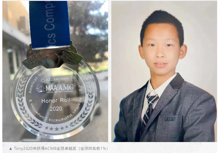 在青苗学校,Tony找到了适合自己成长的环境。学校不仅重视学术,还精准地激发了他对数学的兴趣和信心。据妈妈分享,Tony真正对数学产生兴趣并建立自信,是在学校组织的AMC8竞赛中,他在那次竞赛中取得了优异成绩。孩子的自信心需要通过成功的体验来建立,而这次竞赛为他提供了这样的机会。2020年,Tony获得ACM8全球卓越奖,位列全球排名前1%。