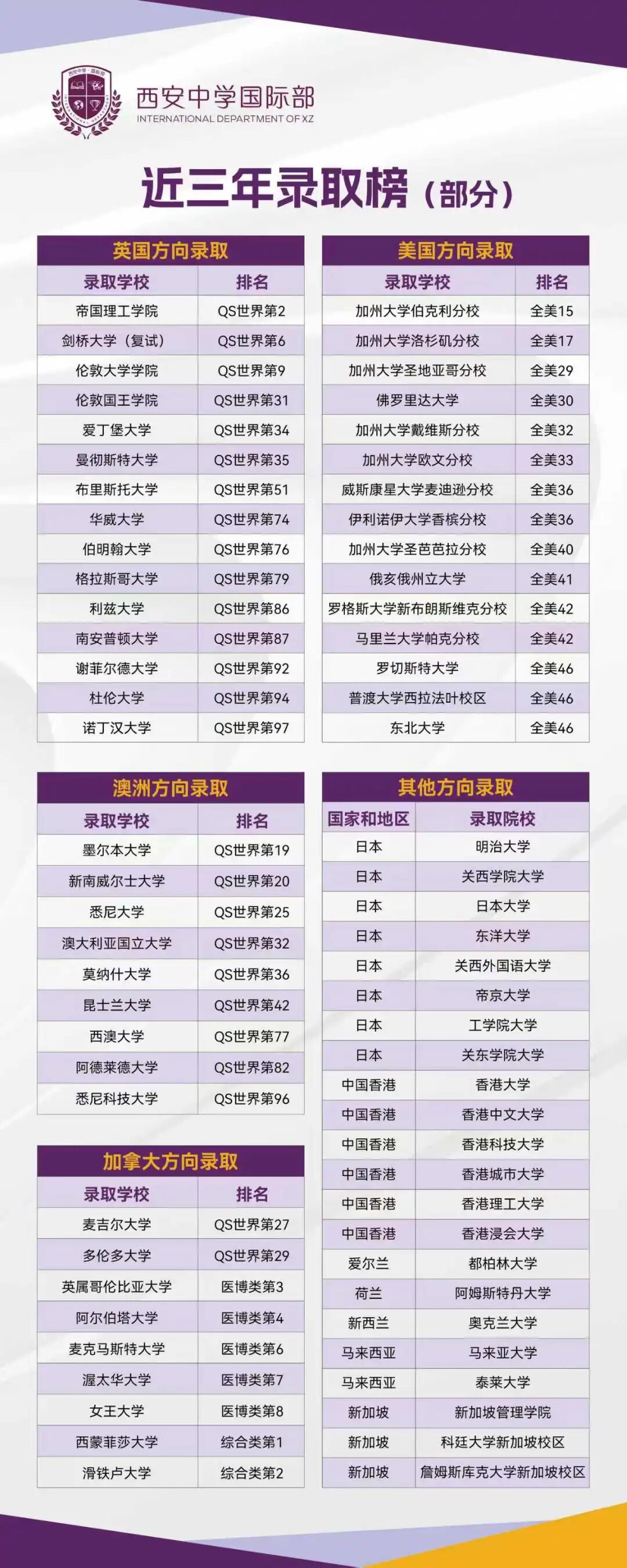 录取院校主要集中于Top前50。墨尔本大学在录取中表现突出,悉尼大学、澳大利亚国立大学、莫纳什大学等院校在国际认可度与院校层级上保持稳定优势。如悉尼大学在2026年QS世界排名第25位。